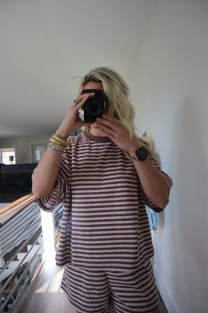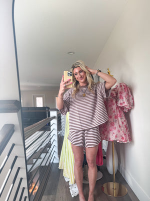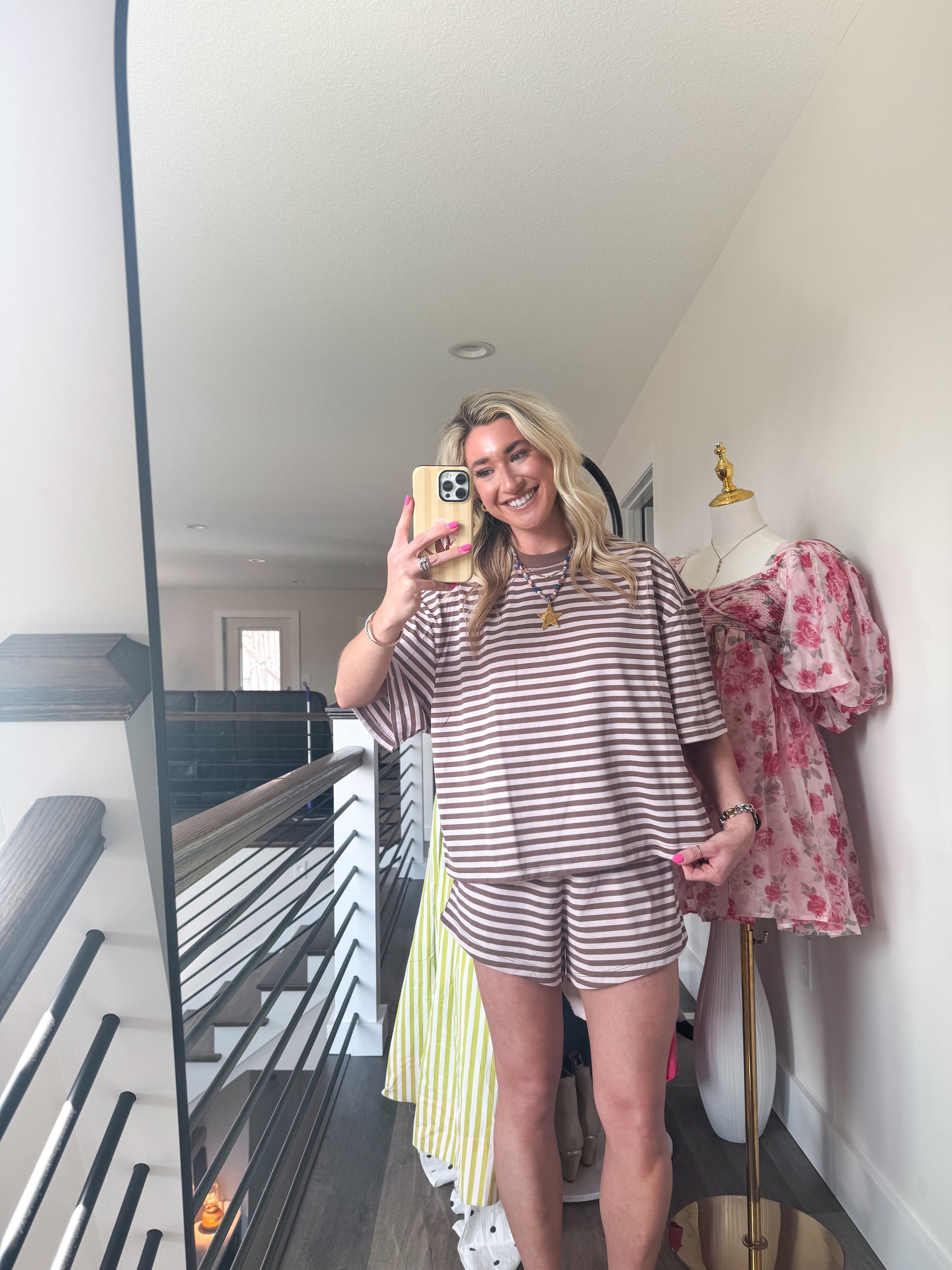 The Caramel Dream Short Set pairs effortless comfort with timeless style. This coordinated set features a soft crew neckline top with an oversized, boxy silhouette and dropped shoulders, paired with relaxed elastic-waist shorts. Horizontal stripes run throughout both pieces, creating a cohesive, laid-back look. The knit construction offers breathability and softness, while the pull-on shorts design makes getting dressed a breeze. Perfect for lounging, running errands, or casual weekend wear.