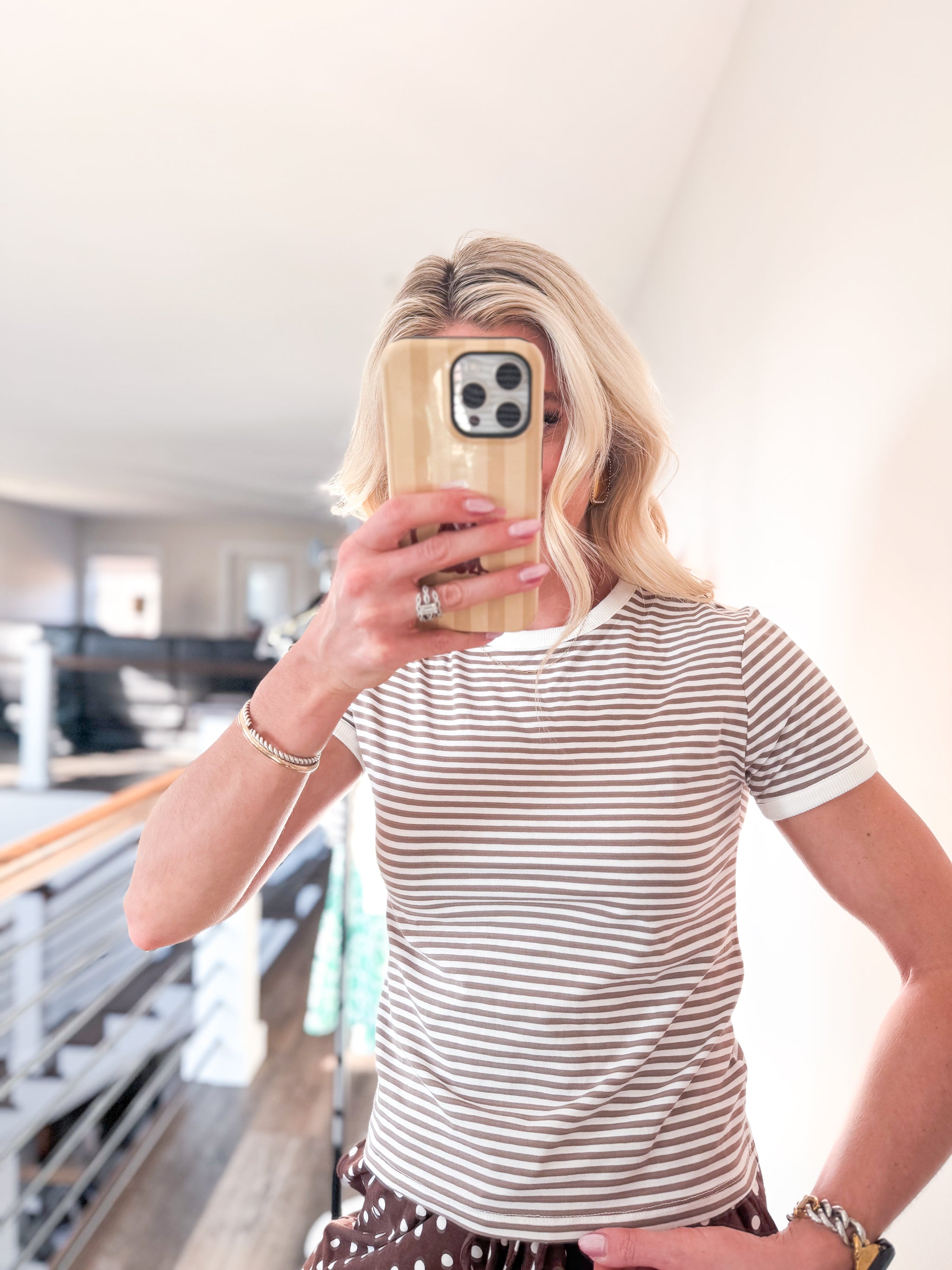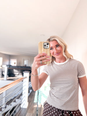 Soft and versatile, this baby tee features a classic brown and white striped pattern that pairs effortlessly with any wardrobe. The fitted silhouette flatters all body types while the breathable fabric keeps you comfortable throughout the day. Perfect for layering or wearing solo, this timeless staple is an essential addition to your casual collection.