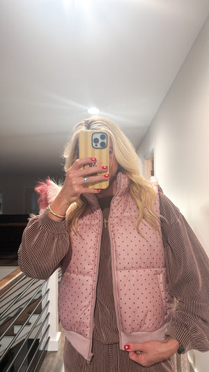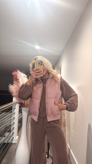 Layer up in style with the Rosewood Puffer Vest, your new go-to for cozy outdoor adventures. This playful two-tone design blends soft mauve with rich brown tones for an effortlessly chic look. The full-length zipper makes it easy to adjust your warmth on the fly, while cleverly placed pockets keep your essentials close. Whether you're running errands or exploring nature trails, this comfy vest delivers the perfect balance of comfort and personality.
