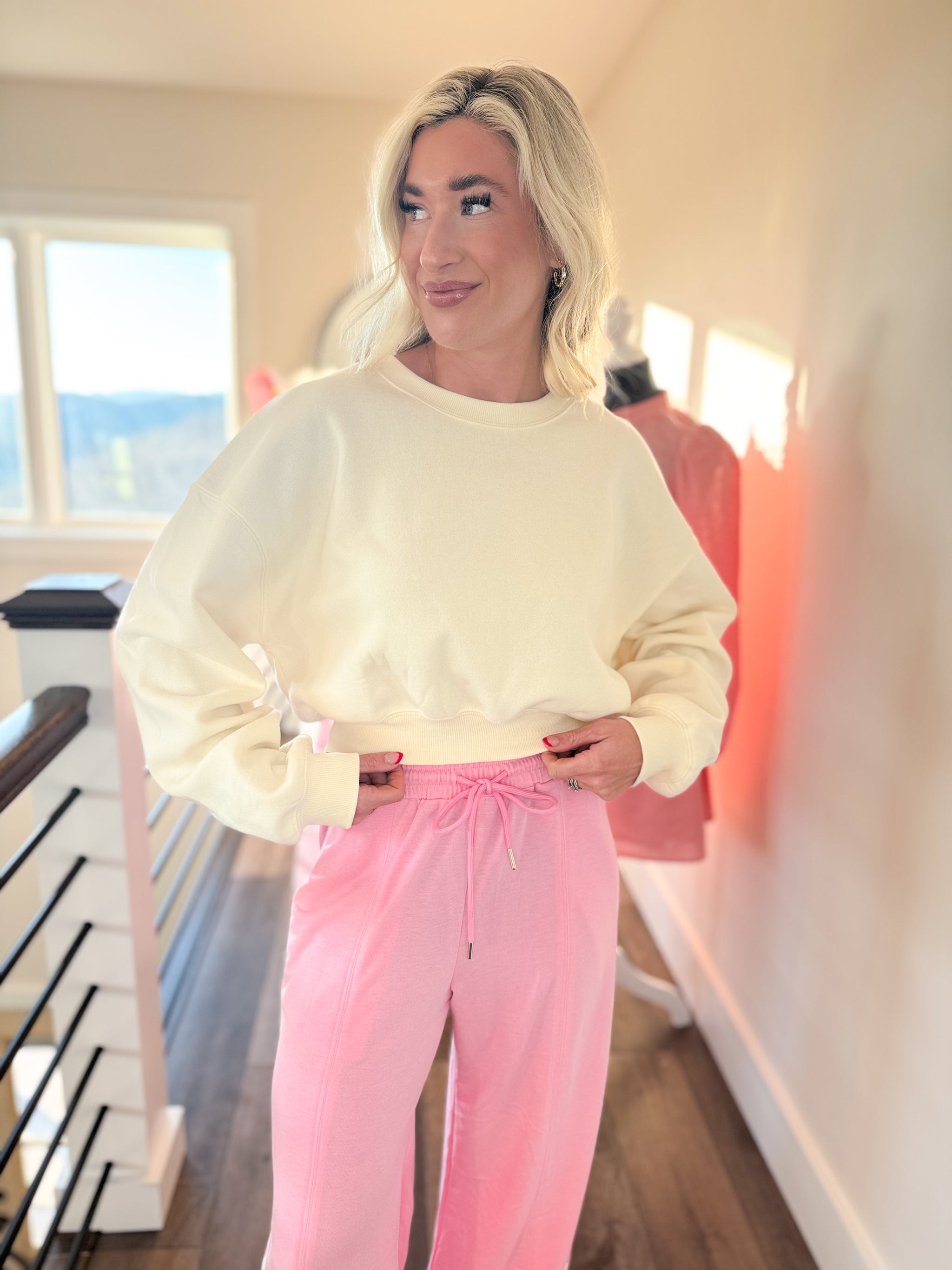 Cozy meets casual in this cream-colored cropped sweatshirt that's basically your new best friend. The relaxed pullover silhouette features a classic crew neckline, long sleeves with trendy drop shoulders, and a banded hem that keeps everything in place. Whether you're running errands or settling in for a lazy day, this easy-to-wear piece pairs perfectly with your favorite jeans for that effortless fall vibe. Throw it on and go—comfort never looked so good.