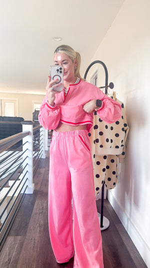 Snuggle up in sweetness with our Cupid's Candy Set—a playful pink and red color-blocked lounge duo that's pure comfort goals. The oversized top features a charming split neckline and drop shoulders for an effortlessly relaxed vibe, while long sleeves keep you cozy. Pair it with the wide-leg pants featuring a stretchy elastic waist and functional side pockets—because comfort shouldn't mean sacrificing practicality. Perfect for lazy days, work-from-home sessions, or whenever you want to feel like you're wrapped in a hug.