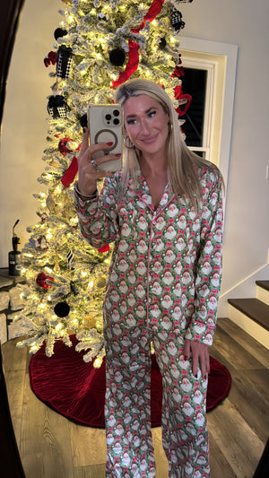 Slip into holiday magic with our Santa Claus Print Satin Pajama Set. Crafted from luxuriously silky satin, this playful two-piece features a button-up top with a notched collar, chest pocket, and charming pink piping detail. The wide-leg bottoms boast an elastic waistband for all-night comfort. Perfect for cozy Christmas nights or gifting to the Santa lover in your life—because the best part of the holidays is feeling absolutely fabulous while celebrating them.